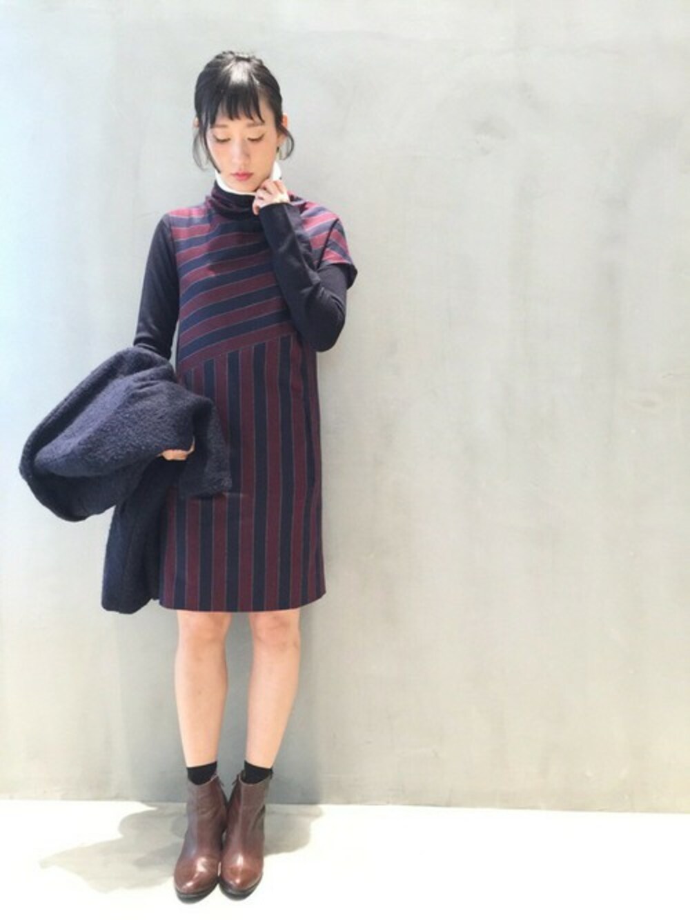 アシンメトリーなデザインが目を引くCARVENのニットワンピースにインナーをレイヤードしてカジュアルに着てみました。