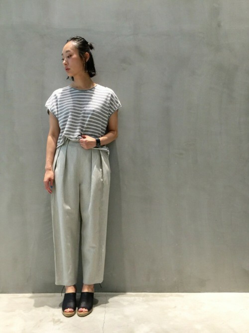 V room のTシャツはタオルのように着心地が良く毎日着たいくらいです。 ボトムスはELINのドローパンツ。タックがダブルで入っているのがポイント、ゆたっとしたシルエットが可愛いです。