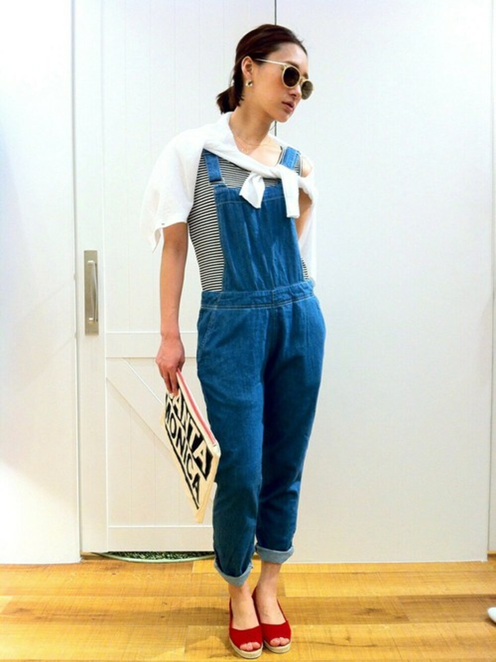 休日にぴったりな楽ちんサロペットのコーデをしてみました。 子供っぽくならないよう、赤のサンダルでビビッドにキメてみました!!