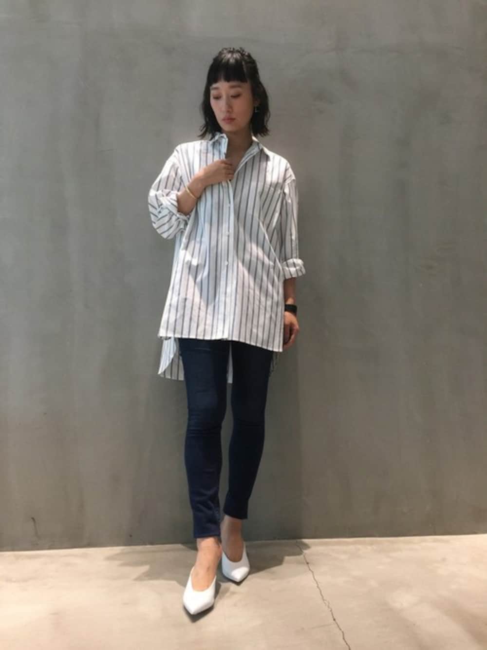 オーバーシャツにはラインのでるスキニーデニムで女性らしく。