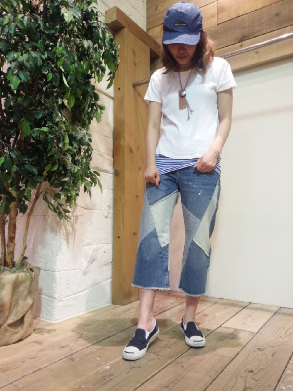 パッチワークが可愛いデニムなので トップスはシンプルに合わせてみました* 他にはないオールドベティーズらしいアイテムです(*^_^*) 今日も暑いですね~;;