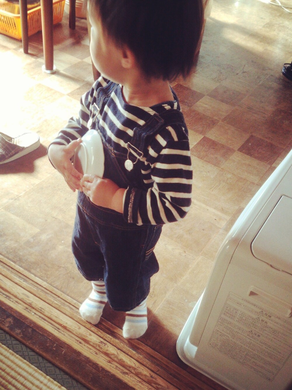 実家にて! お皿を持って放浪中。。 オーバーオール:アニエスベー