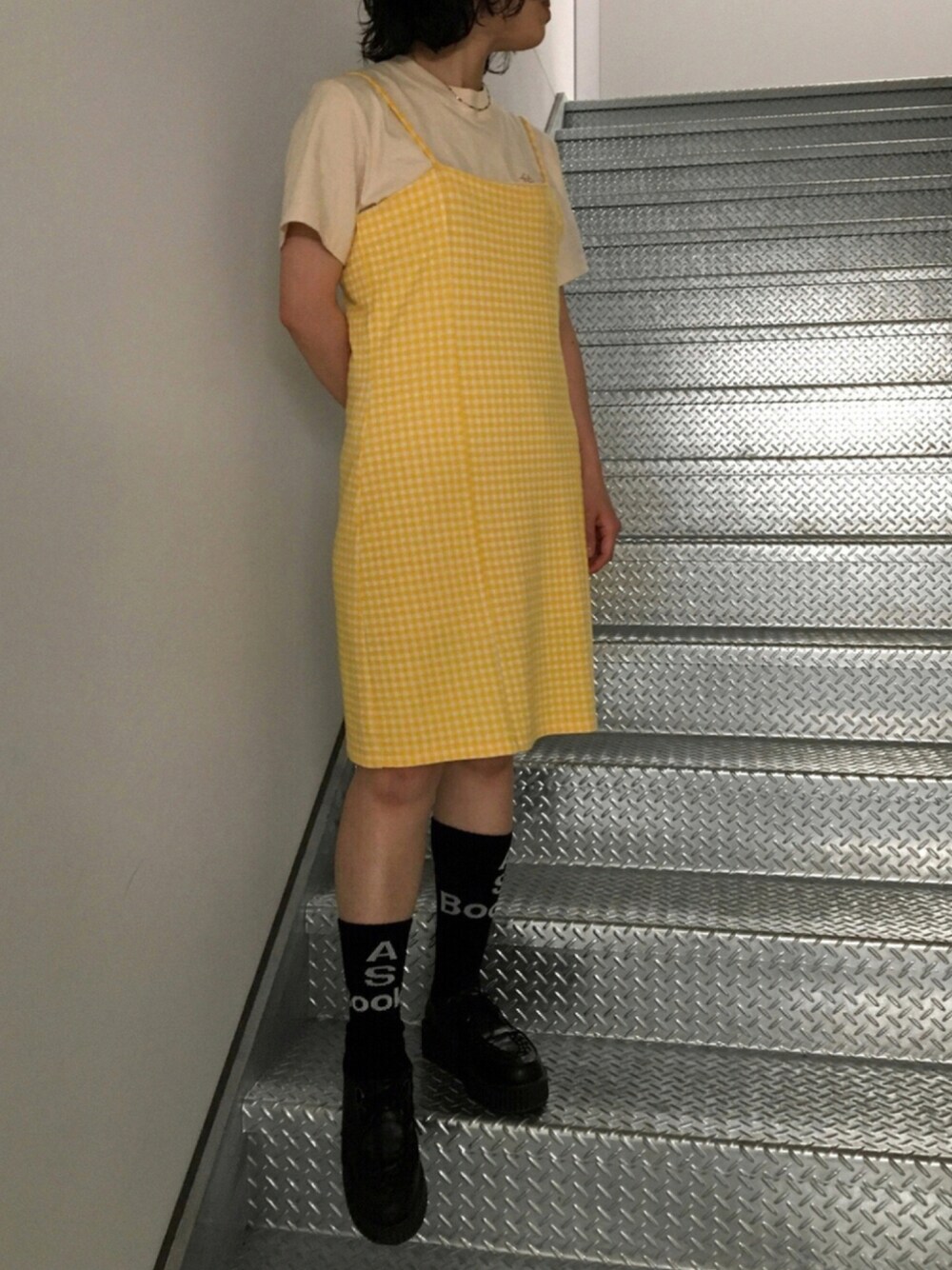 ◯Bonjour Girlギンガムチェックワンピース ゆとりのあるシルエットに伸縮性のある素材で着心地抜群です👌 Tシャツとのレイヤードはもちろん、キャミソールやタンクトップなどの肩出しトップスとの組み合わせもおすすめです。 フリーサイズで156cmだと膝上の丈感でした。 今回足元はブラックでまとめてメリハリを意識しました! ソックスは出版社でもあるアクチュアルソースのものです◎ しっかりとした厚手の素材が履き心地良く、ユニセックスで激おすすめアイテムです🤝
