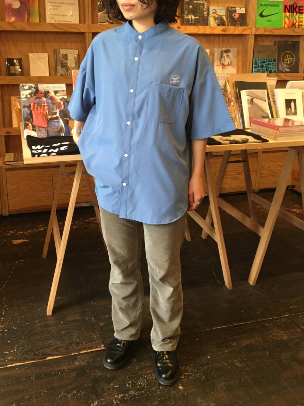 ○ 【bonjour bonsoir】バンドカラー半袖シャツ デザイン違いの襟付きに比べ、こちらは着丈がやや短めでカチッとした印象。 きれいめがお好みの方におすすめです! グレーがかった色味で今から秋口まで使えそうです◎ 羽織でも使えるシンプルなシャツは着る物に迷った時に重宝するアイテム間違いなしです!