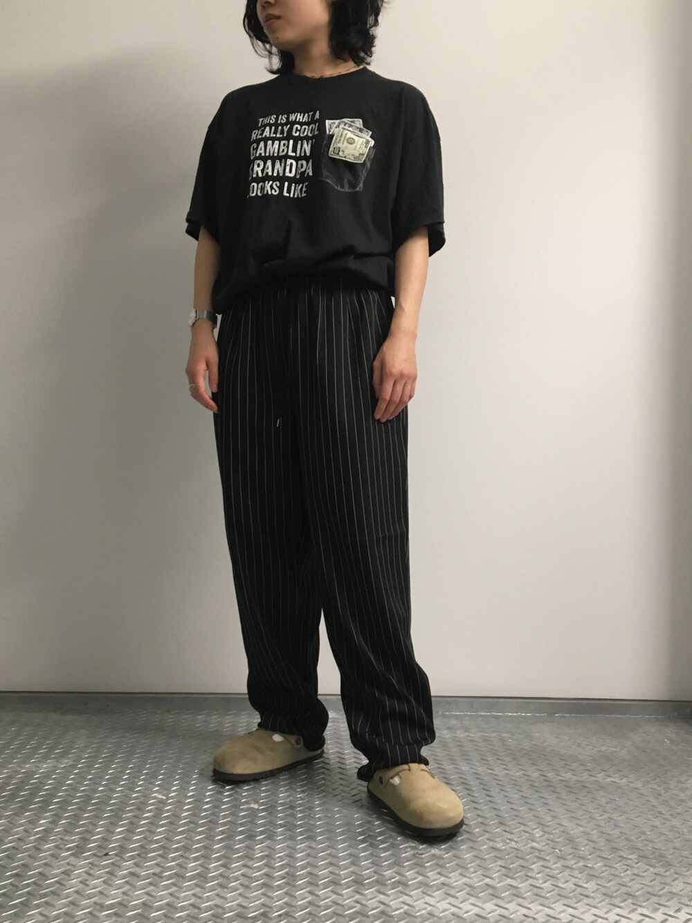 ◯【bonjour bonsoir】ストライプシェフパンツ するするとした薄手の素材が履き心地抜群です!! Sサイズを着用。 裾に向かってややテーパードの太めのシルエットになっており、裾の部分がくしゅくしゅするのがいい感じです!(試着推奨です!) パジャマっぽい脱力感がありますが、タックが入っているためゆるすぎない雰囲気が◎ 夏にもってこいのおすすめパンツです!
