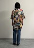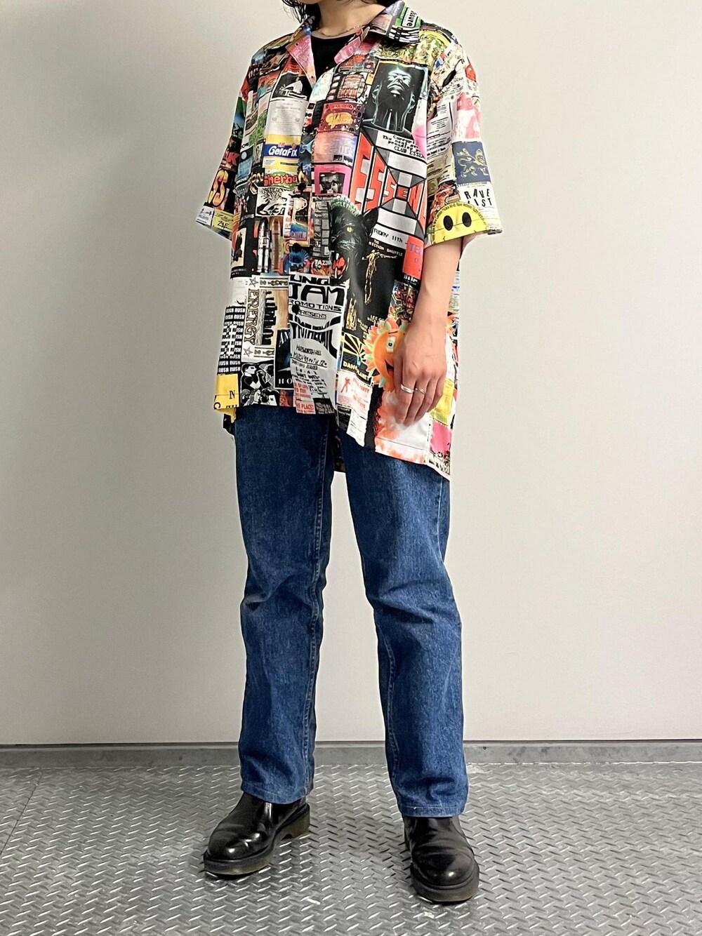 Lサイズを着用。 肘、ヒップ共に隠れるほどの丈感でした。 サテン生地×フライヤーの総柄でいい意味でチープ、今回のコレクションにはまりまくっている1着です。 ダメージが効いたデニムやフレアパンツを合わせて浮かれたスタイリングもおすすめです! 是非店頭にてお待ちしております。
