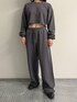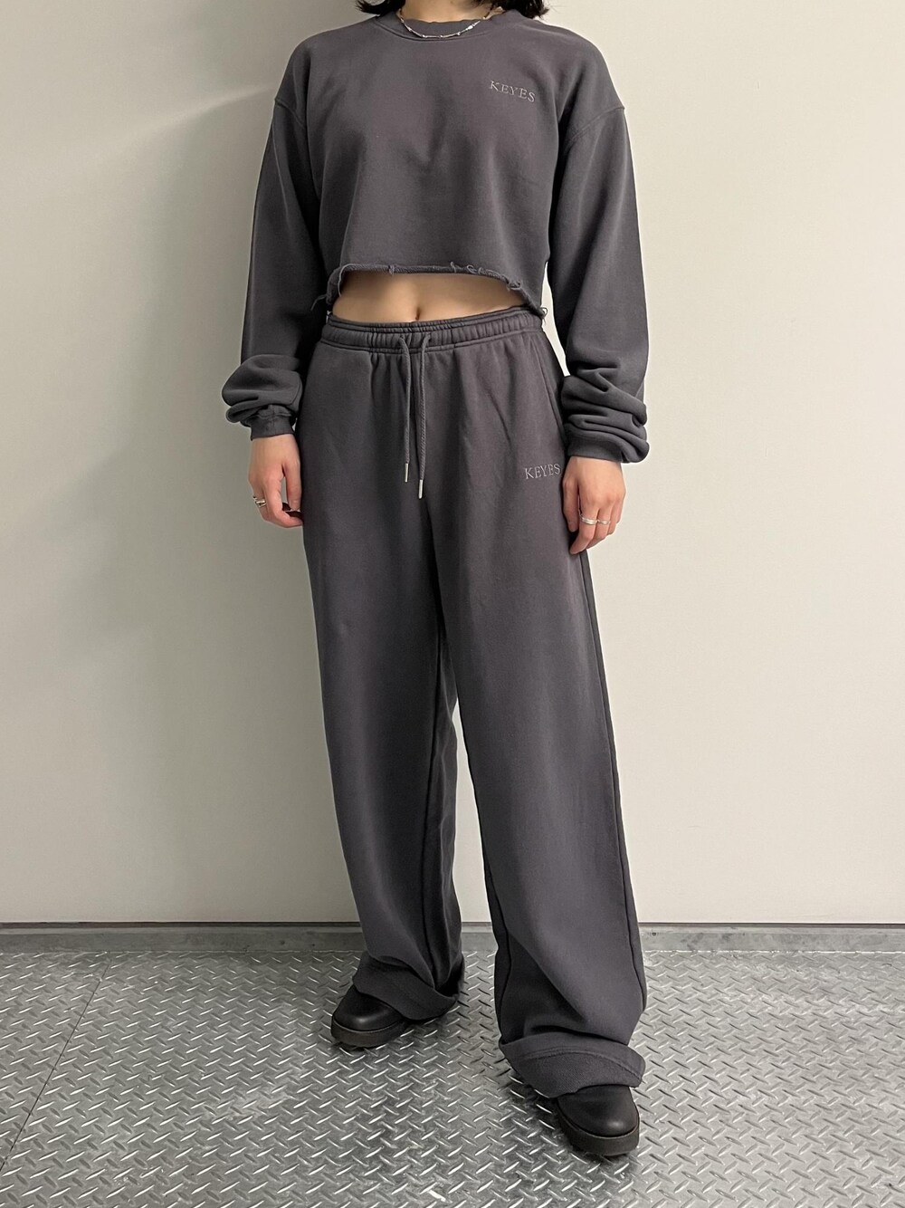程よい厚みの裏毛スウェットでさらりとした肌触りです。 トップスは指先まで隠れる程の袖丈でした。 同ブランドのスポーツブラとセットで着こなすのもおすすめです。 パンツは幅広のストレートシルエットでゆったりとした着心地です。 丈が長めなのでロールアップをしても◎ 是非店頭にてお待ちしております。