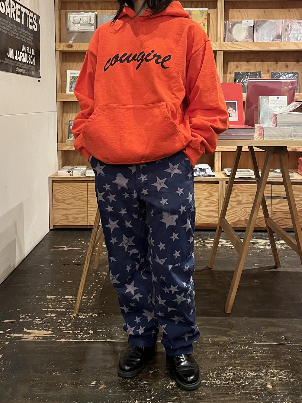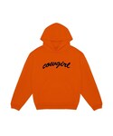 tops:cowgirl "Script Hoodie" 元々はデザインスタジオとして活動をしていたブランド。 オレンジ赤のぱきっとしたカラーにシンプルなグラフィックが映えます! Mサイズを着用。 身幅が大きく、丈が短めのシルエットでいろんなシルエットのボトムスと相性が良さそうです! 固めの生地でくたくたになるまで着倒したい気持ちになりました。 今回は星柄のパンツに合わせてアメリカンな雰囲気にしてみました。 是非店頭にてお待ちしております。