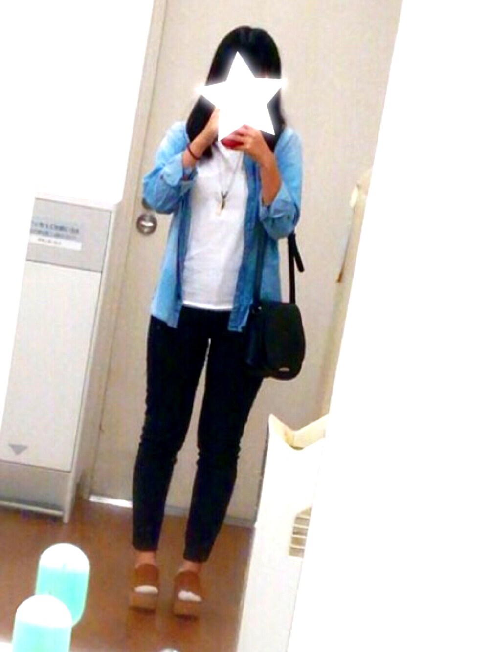 久しぶりにスキニーを履いてみました。 GUのサンダルを履くことで足長効果になります!😊 体の縦ラインを意識することでウエストのカバーなどができます。
