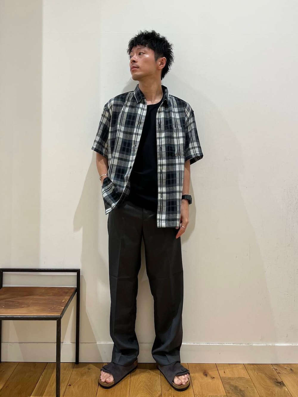 カジュアルなチェックシャツにはキレイめなスラックスを合わせると子供っぽくならないです!
