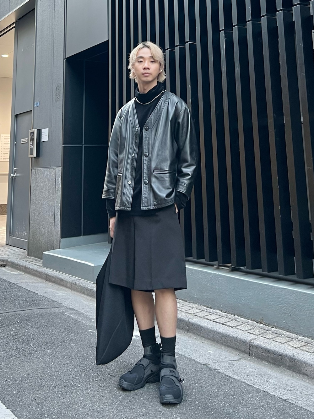 レザージャケット/KIDILL タートルネック/JUHA ハーフパンツ/ADANS スニーカー/comme des garcons homme plus×NIKE ネックレス/Jieda 鞄/MM6