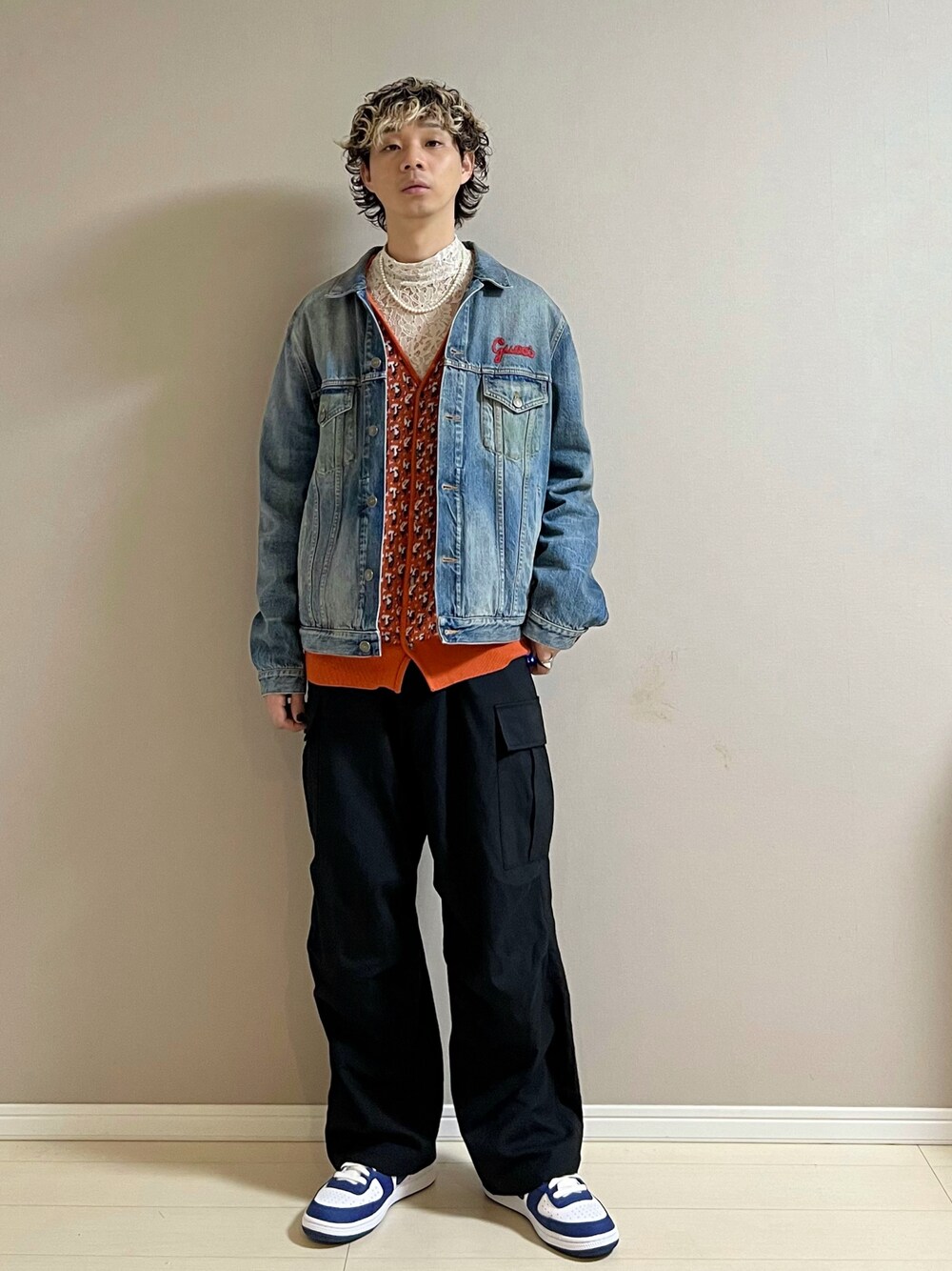 デニム/GUCCI カーディガン/toga virilis レーストップス/JUHA パンツ/JUHA スニーカー/NIKE×COMME des GARCONS HOMME PLUS ネックレス/MONKEY TIME