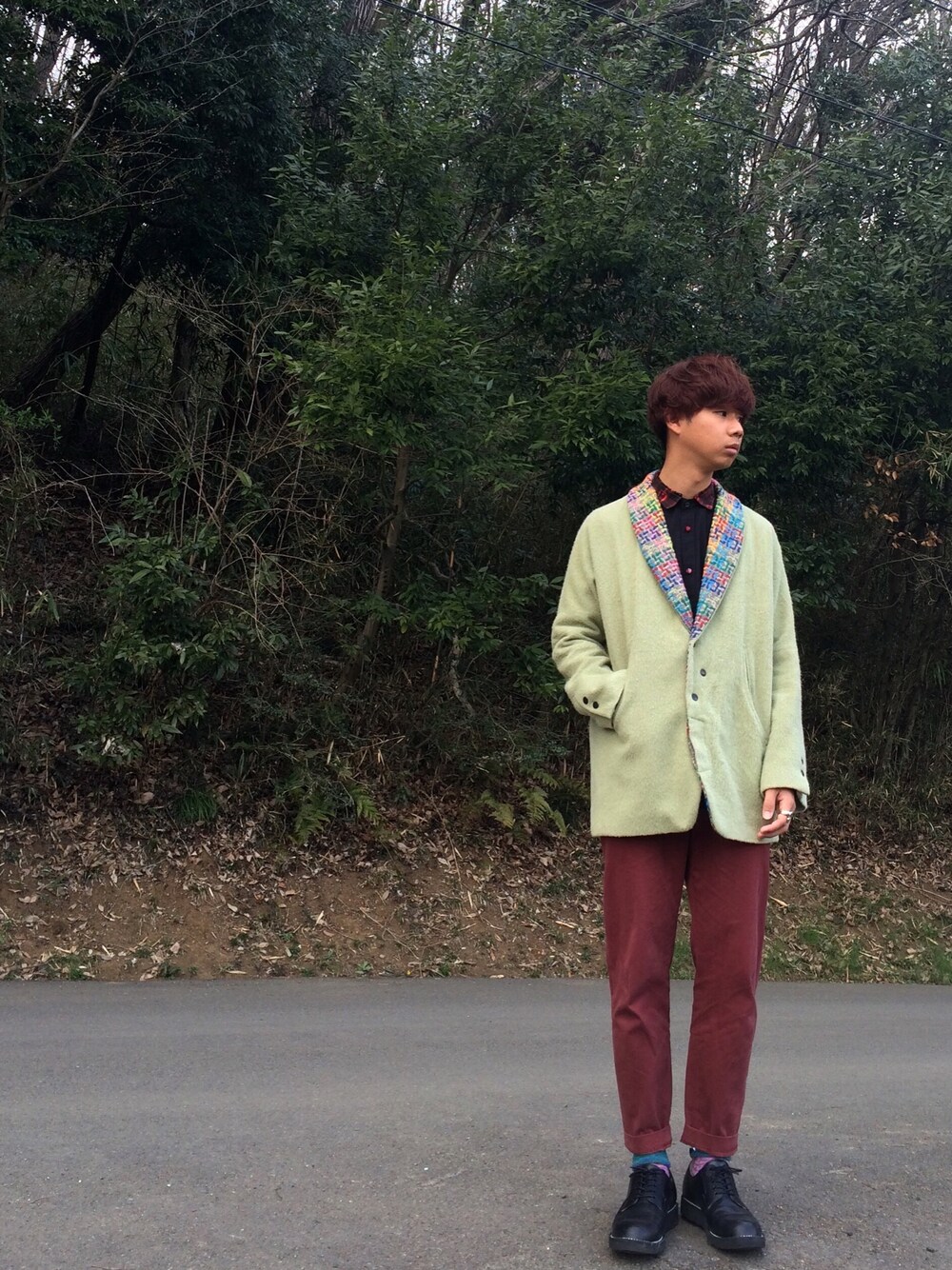 ショールカラーコート/.efilevol シャツ/j.27 イージーパンツ/ETHOSENS 靴/uniform experiment トランプリング/MILKBOY イメージは、「落ち着き」。 今日も大好きなゆったり服です。 この場所の時はよく横を向いていますが、これは人が来ないか見ながら撮っているからなんです、びくびくしながら撮ってますね。笑