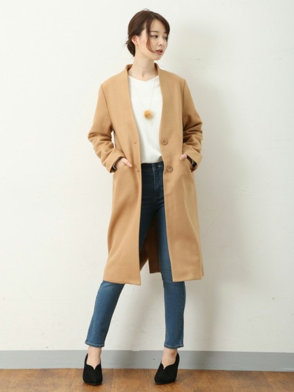 ●アウター すっきりとしたシルエットで洗練ムードただようカラーレスコート。ウール混のふっくらとしたモッサ素材を使用し、上品であたたかみのある風合いに仕上げました。膝下までのロング丈が大人っぽく、こなれた着こなしが叶います。通勤はもちろんラフに羽織ってカジュアルにも、オンオフで活躍します。 ●トップス 表情のあるツイルジャガードのVネックプルオーバー。カジュアルにもきれいめにも着こなせて、裏起毛でこっそりあったかいのもうれしいポイント♪今年っぽいファー付きネックレスが着こなしのアクセントに。 ●ボトムス ジャストな股下70センチ。ハニーズ定番人気のデニムスキニーにユーズドタイプが登場。伸びやかでストレスのない着心地はそのままに、こなれコーデに格上げしてくれる驚きのコスパアイテム!豊富なサイズ展開も魅力です。