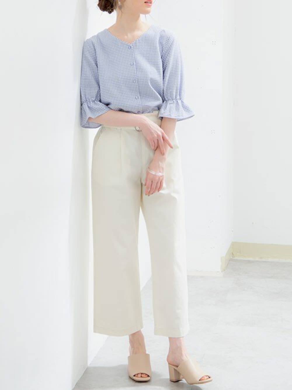 ●ブラウス(品番:525-64-9282) ふんわりキャンディースリーブが大人可愛いブラウス。 デコルテをきれいに見せてくれるVネックで、すっきり甘すぎない印象に♪ 表面変化がありサラッとした着心地のサッカー素材で、これからの季節にぴったり◎ ●パンツ(品番:548-72-0441) 広がりすぎないストレートシルエット&ハイウエストデザインで、スタイルアップ効果抜群のパンツ。 人にも環境にも優しい、高品質なUSAコットン100%の薄手デニム素材を使用。 ●サンダル(品番:266-134-7804) オープントゥで適度な抜け感を演出してくれるミュール。 さっと履けて通気性がよく、暑い日でも快適♪ 太ヒールと足を包み込むようなデザインで安定性も抜群◎
