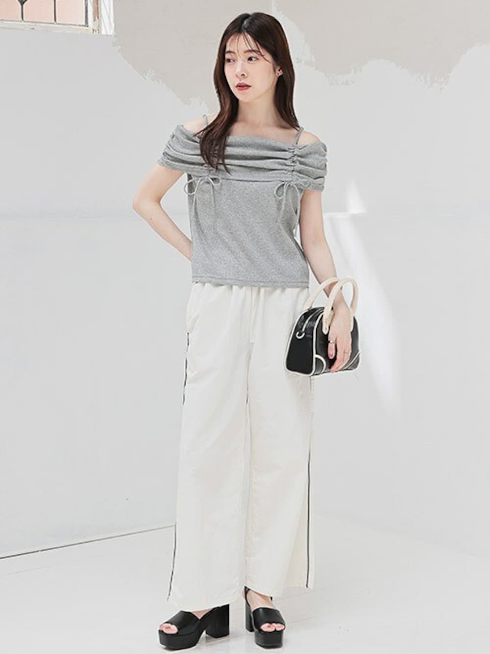 この夏着たいオフショルトップスは、トラックパンツやボストンバッグを合わせてカジュアルな雰囲気に! ・トップス ▶ 578-13-9580 ・パンツ ▶ 573-73-0978 ・バッグ ▶ 268-121-9276 ・サンダル ▶ 235-134-9096