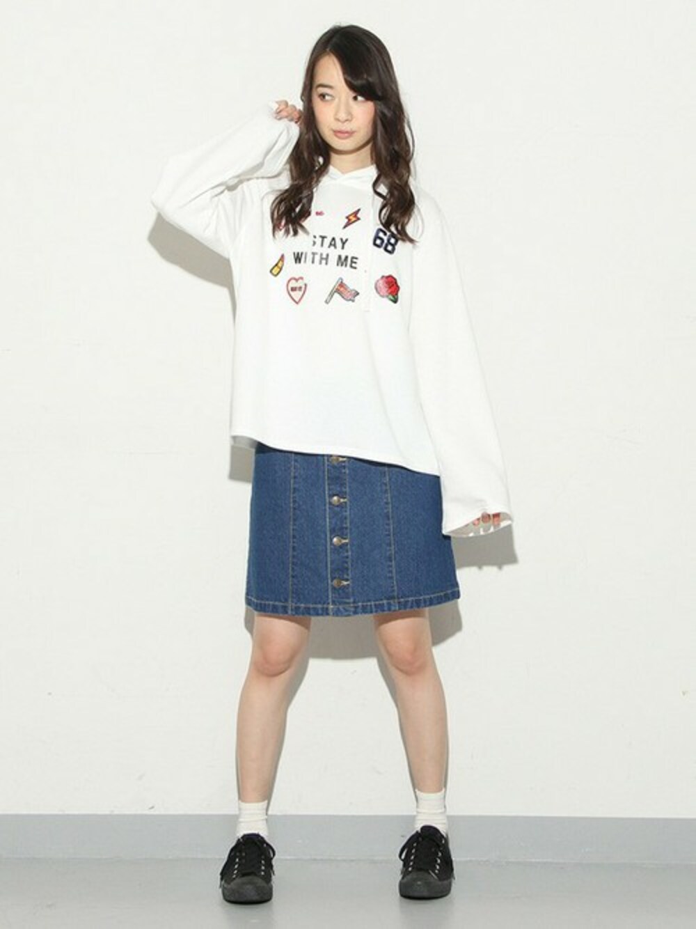 ●トップス たくさんのワッペンを散らしたポップなパーカー☆トレンドのワイドスリーブのデザインで、デニムとのワンツーコーデもおしゃれにきまります。 ●ボトムス 今季トレンドの台形スカート。裾に向かって広がるシルエットが太ももをほっそり見せてくれるうれしい効果も◎トップスインでボタンをポイントにしたり、ゆるトップスと合わせてラフに着こなしてもかわいい!