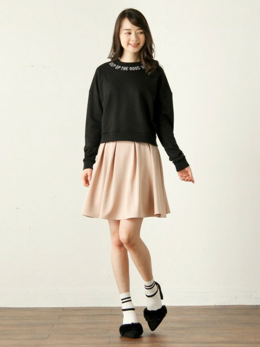●トップス ストリート感たっぷり!ネックライン&袖にロゴ刺繍をデコレーションしたスウェット。シンプルな中にパンチをきかせたデザインでいつものコーデを今っぽくブラッシュアップ。すっきりした丈感だからボリュームボトムにも合わせやすい♪ ●ボトムス フレアシルエットがキュートなスカート。インナーパンツ付きだからミニ丈でも安心して楽しめる!トップスインコーデがサマになるベルト付き♪ ●シューズ トレンドライクな足下を演出するファーパンプス。ポインテッドトゥ&セパレートデザインの上品なルックスでカジュアルコーデに女っぽさを足したり、思いっきりガーリーに合わせたり、冬コーデの頼れる相棒になってくれそう。美脚と歩きやすさを兼ね備えた太めヒールもポイントです。