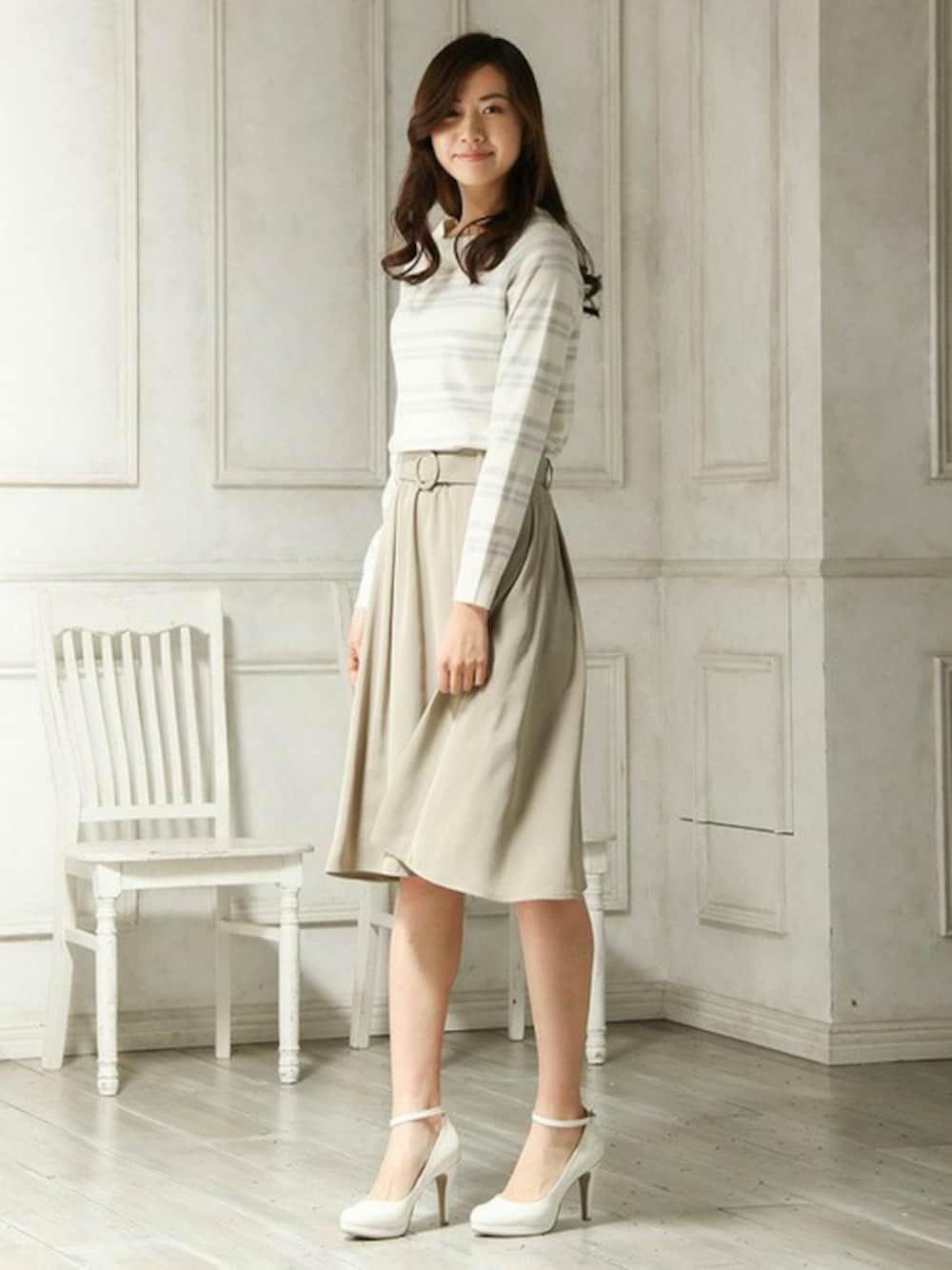 ●トップス 広めのリブが特徴のラウンドプルオーバー。ほどよい開き具合で上品&フェミニンな着こなしに仕上がります。人気のパステルカラーのカラバリにも注目です。 ●ボトムス ふんわりフレアシルエットが可愛いスカート。取り外しできるベルト付きだから、トレンドのベルトコーデを楽しんだり、シンプルに着たり、アレンジも楽しめます。キレイ見えするミディ丈で通勤にも休日にも大活躍!