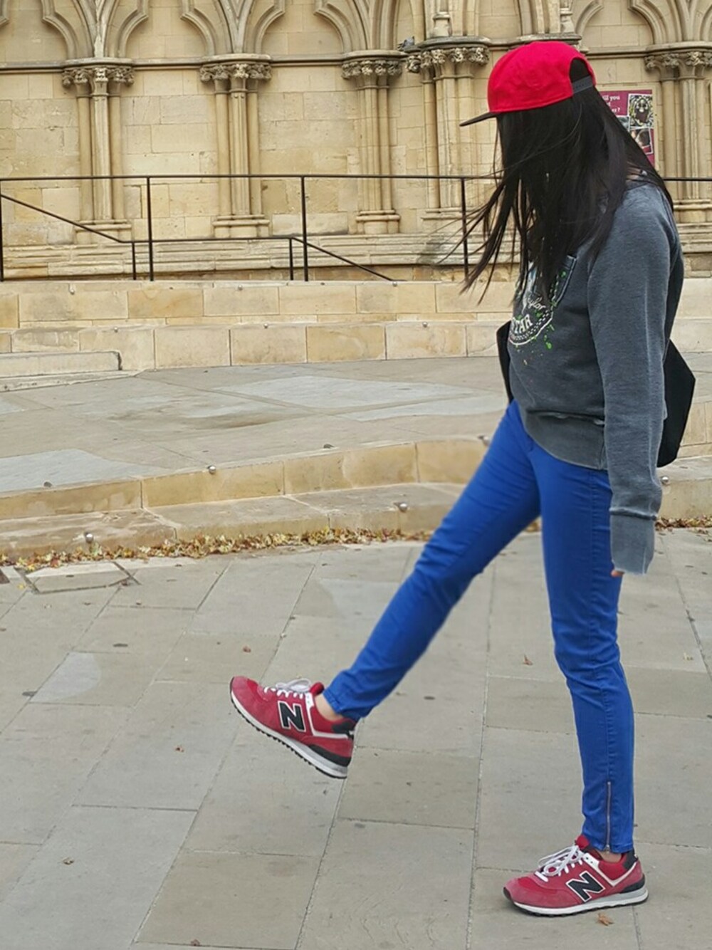 头顶上与脚拥有同色给点特点。因为需要活动。。。所以就配上运动鞋,给方便。也给点颜色。灰色上衣配上深蓝裤。