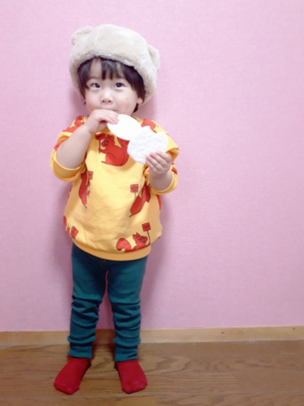 おはようございます! お返事前にごめんなさい💦 西松屋の耳つきファーベレーは去年のもので199円のセール戦利品✨ サイズ50なので温めてましたがまだ大きくて歩くとずり落ちます😂 また来年に持ち越しかな🤔 リス柄のスウェットはあまり見かけないしPOPなカラーはリリにぴったりだなぁとポチ。💸 似たような服が増える増える… 何気に緑と赤で季節感を🎄