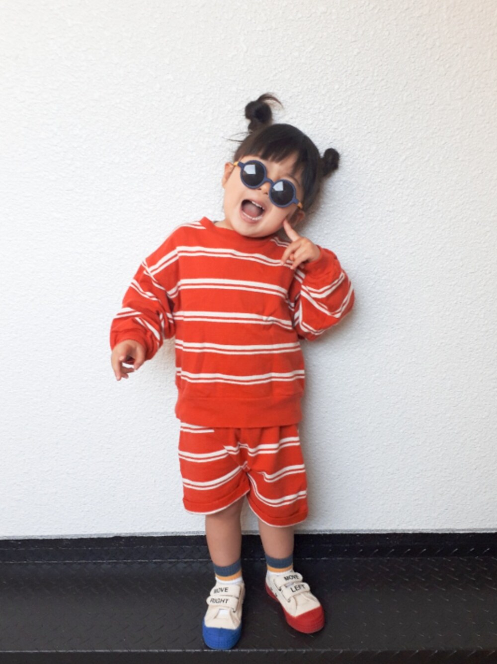 パリピな娘😎 サングラス気に入ったみたいなので伊達眼鏡にも挑戦させよう✌ 赤ボーダーのセットアップにサングラスで陽気な休日スタイル🌴🦀 ちなみに、調子に乗って親子コーデしてしまいました。 でも大窓にする勇気は出なかった…😂