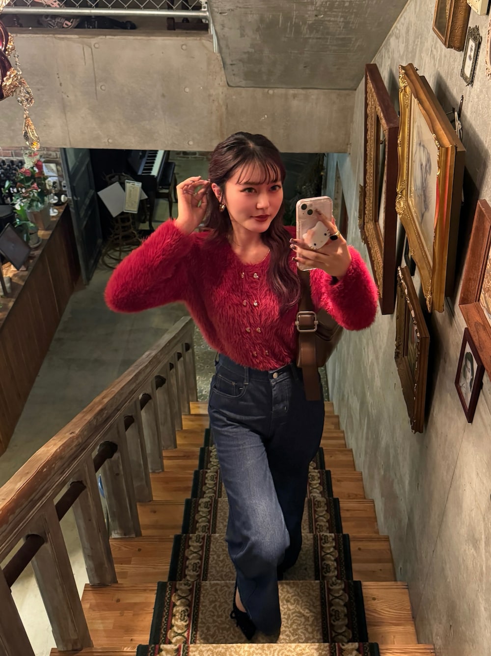 ハートのボタンがワンポイントのふわふわニット🧶 甘めなニットなのでデニムと合わせてカジュアルに💡 クリスマスにも大活躍なニットです♪