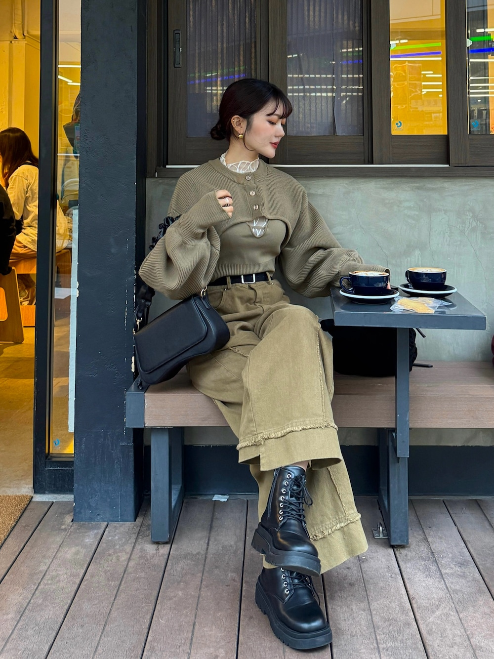 同じ色味のトップスとパンツを合わせた セットアップ風コーデ🫶🏻 小物やシューズはブラックで合わせて コーデにまとまりが出るようにしました💞