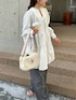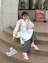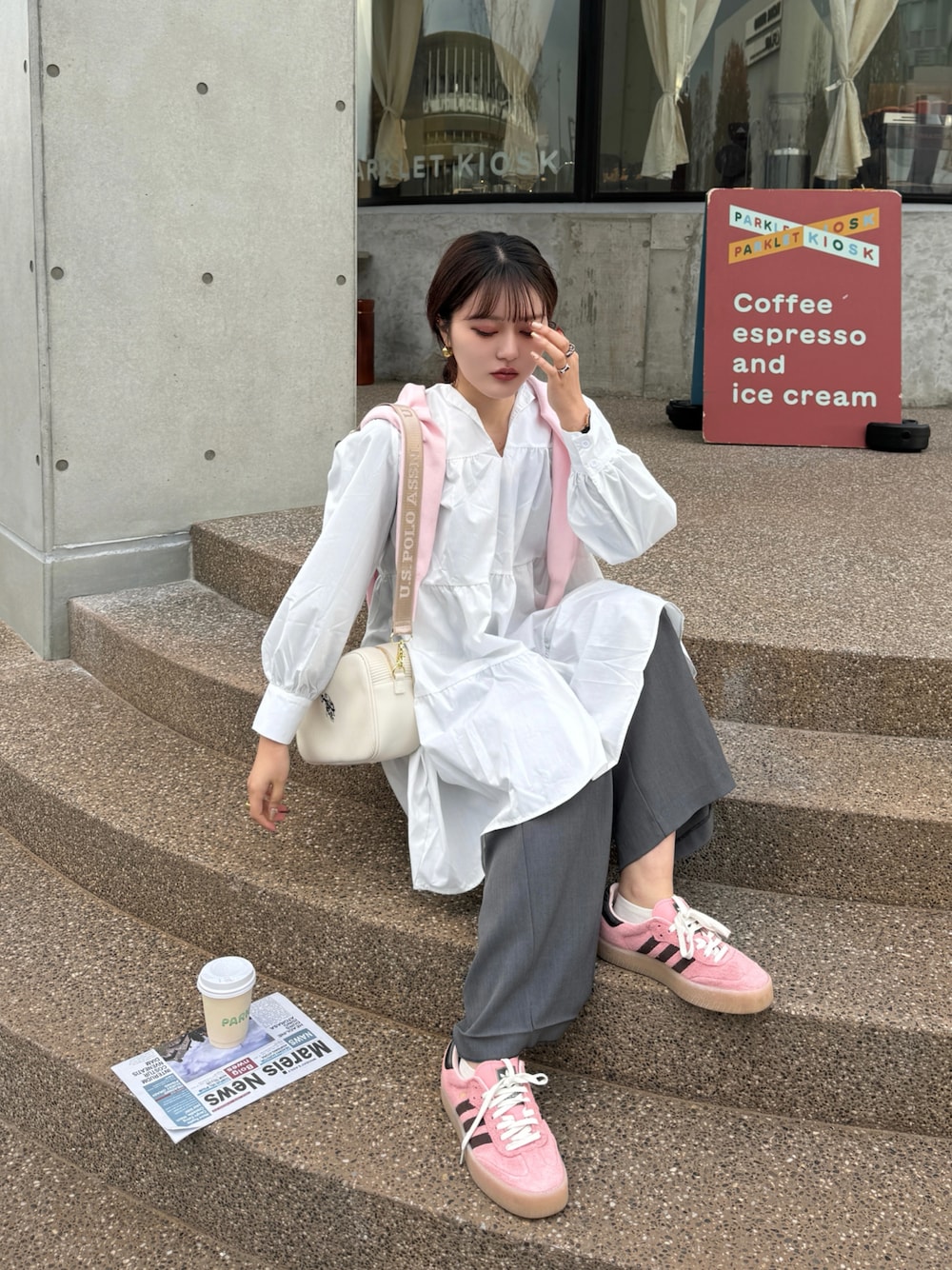 efillのミニワンピにピンクのカーディガンを羽織りました~👍🏻 スニーカーもピンク合わせで春らしいコーデに! ミニワンピは1枚で着ても可愛いし スラックスやデニムと合わせてても可愛いです🙂↕️