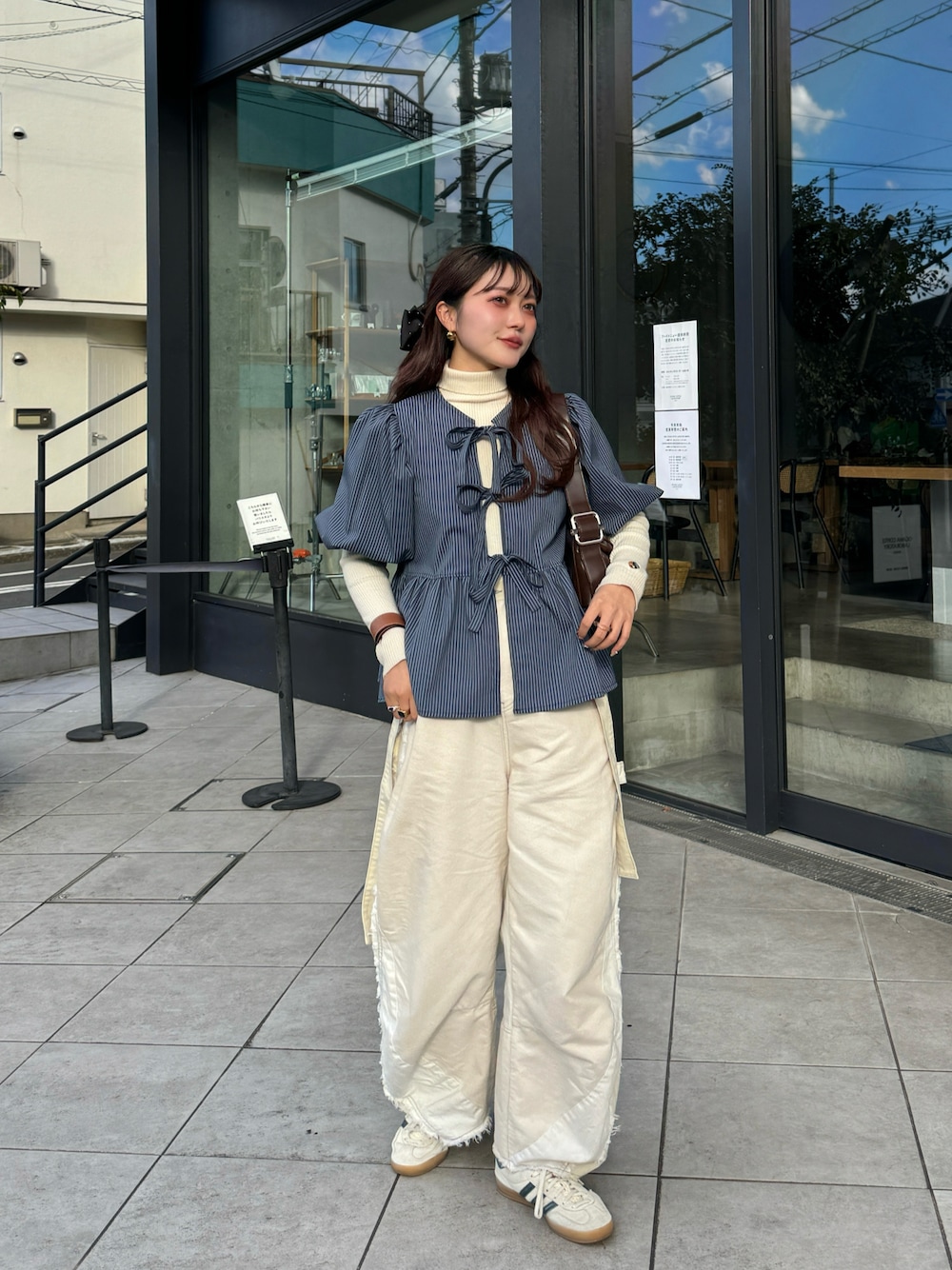 honokaのシャツ/ブラウス「フロント リボン バルーン 袖 ストライプ シャツ」を使ったコーディネート