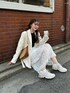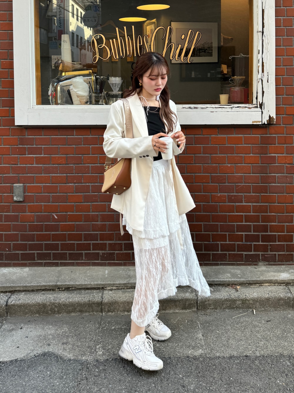 スニーカーを使った綺麗めカジュアルコーデ👀 今年流行りのレーススカートとジャケットを合わせてみました🤍 ジャケットも使い回し抜群で嬉しい🥰