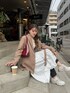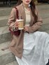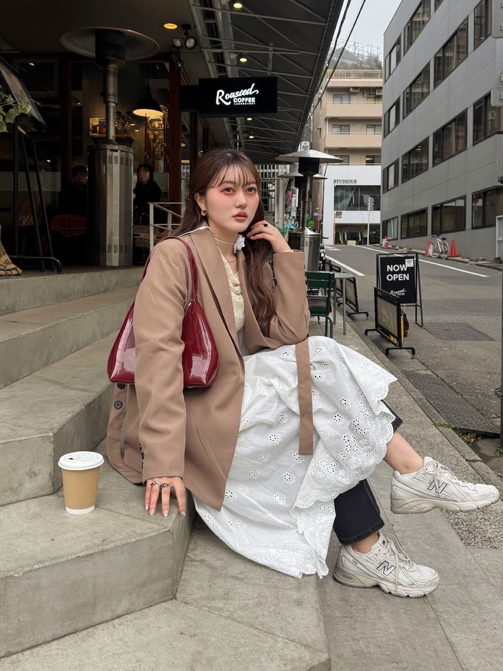 モカムースカラーのジャケットを使った春らしいコーデ~💖 レーススカートと合わせて レイヤードを楽しみました✊🏻