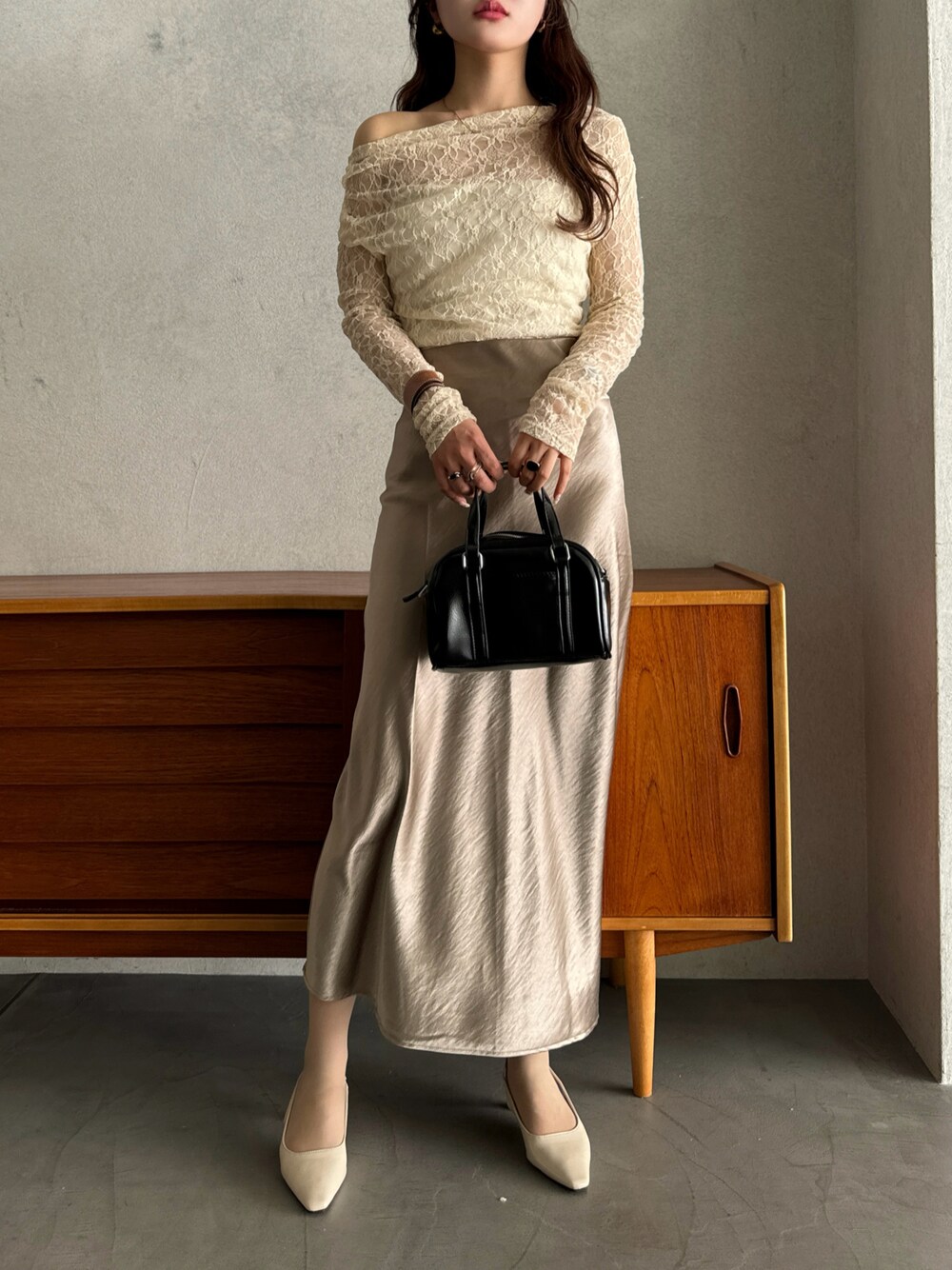 ピンクのサテンスカートが春らしい 綺麗めコーデ🤭🔥 レースアイテムは綺麗めのボトムスにもデニムとかカジュアルなボトムスにも合わせやすいから 沢山着回し効きそう✨