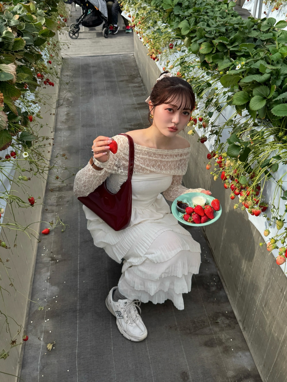 千葉にいちご狩りに行ってきました~💖 いちごが映えるようにオールホワイトに赤のバッグを合わせてみました🫶🏻