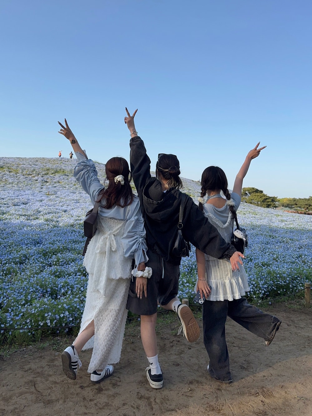 茨城にあるひたち海浜公園に ネモフィラ見に行ってきた~😵💫🤍 みんなで青のシミラーコーデ✨ 青に白が映えて可愛かった~!