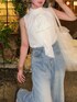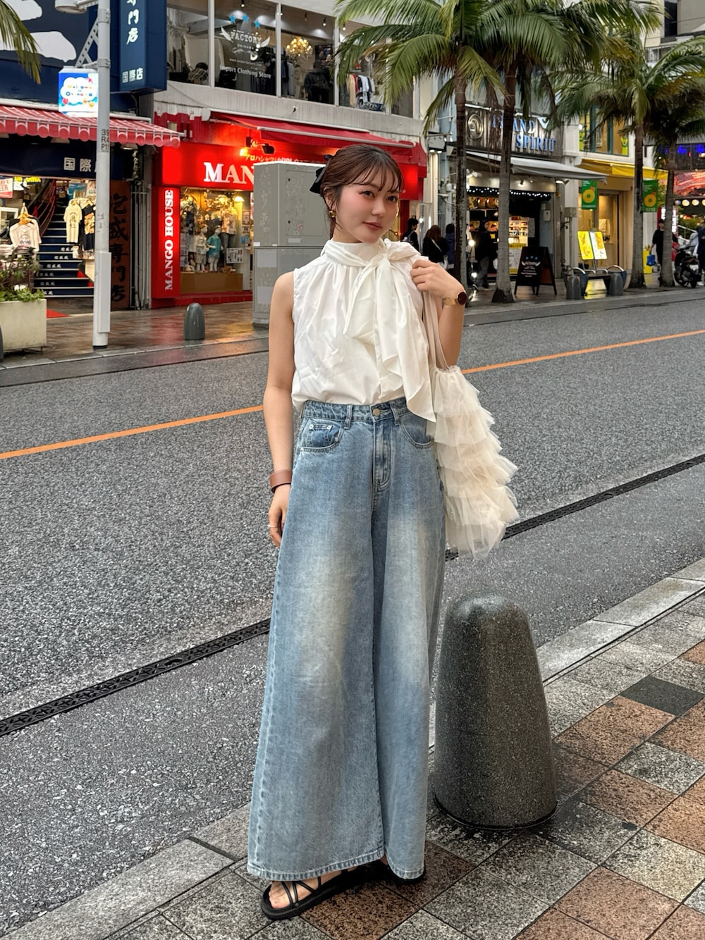 旅行1日目のコーデ👀 居酒屋に行く予定だったので 綺麗めカジュアルに、、💕 大きめのリボンが可愛いブラウス、、