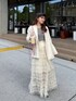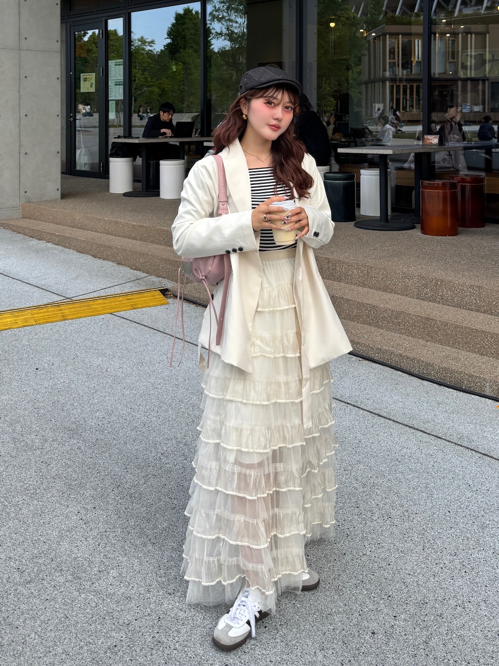 ティアードのチュールスカートとジャケットを合わせた綺麗めコーデ🏷️ ハンチング帽とスニーカーで 甘めにしすぎずカジュアルなスタイルに✨