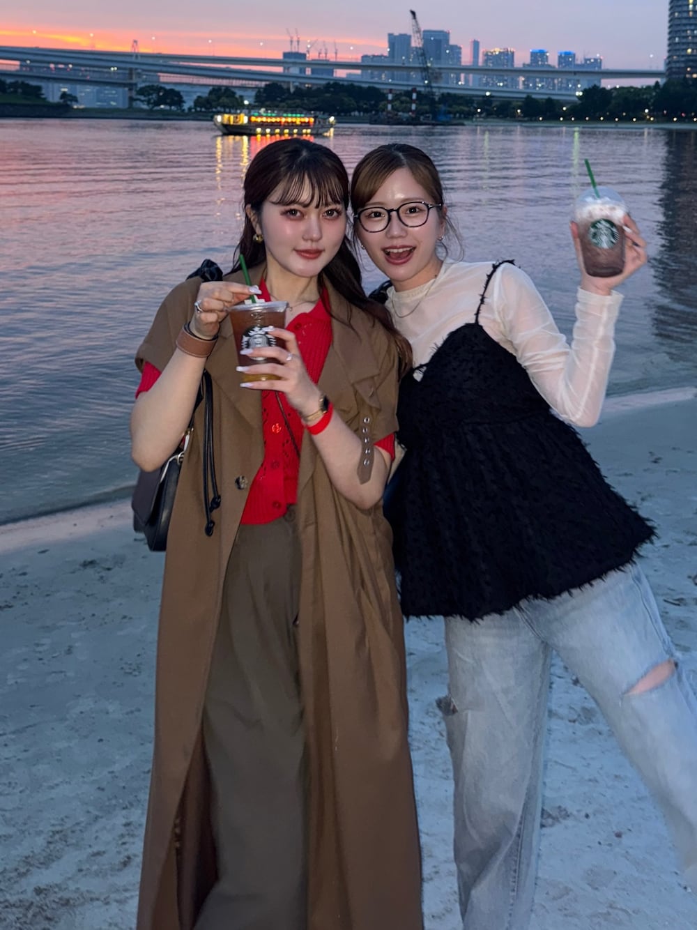 お台場にBBQをしに行った時のコーデ! 友達ショット🫶🏻 夏っぽく赤のレースのトップスを着ました✨