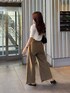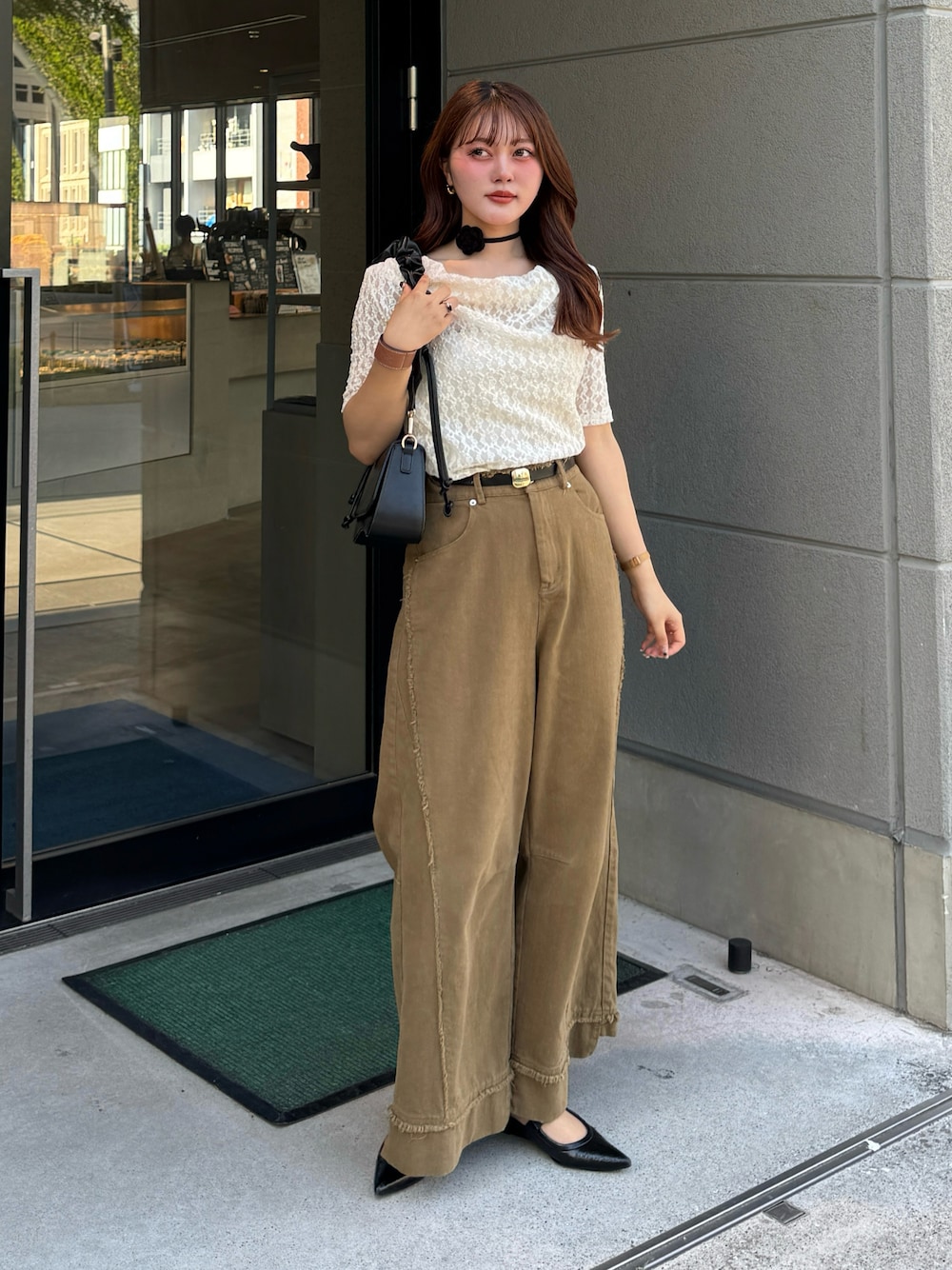 カーキのデニムと綺麗めのレーストップスを合わせました👀 ベルトやバッグ、ミュールを黒で統一! 綺麗めカジュアル大好き💞