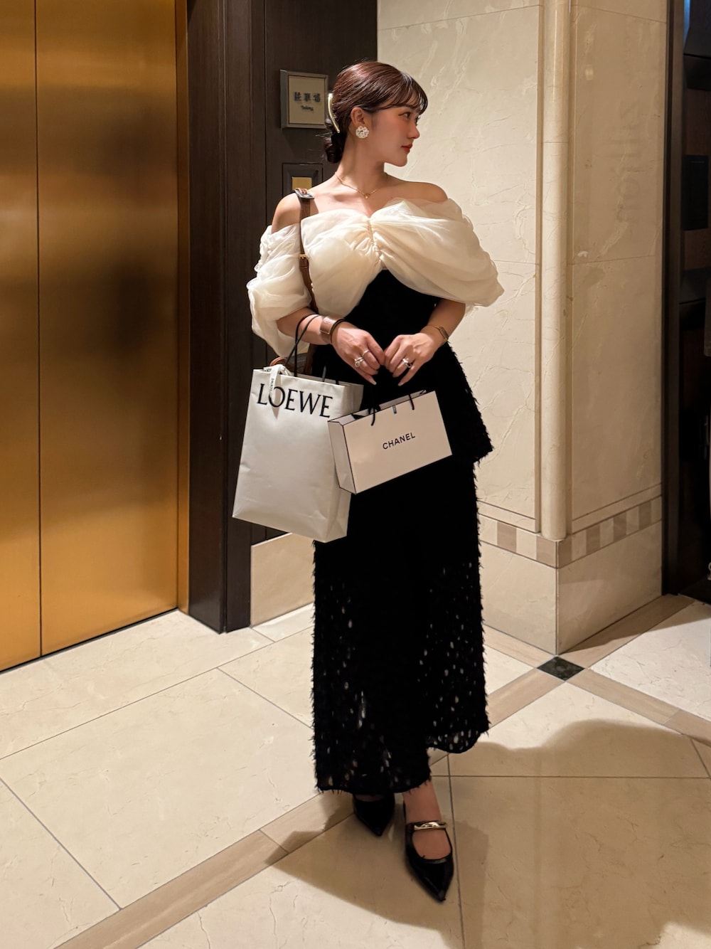 ディナーに行った時の綺麗めコーデ✨ ラベルエチュードのチュールのトップスが可愛い🥺着回し抜群🫶🏻 黒のビスチェとスカートのセットアップに くみあわせました💕