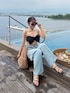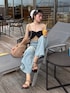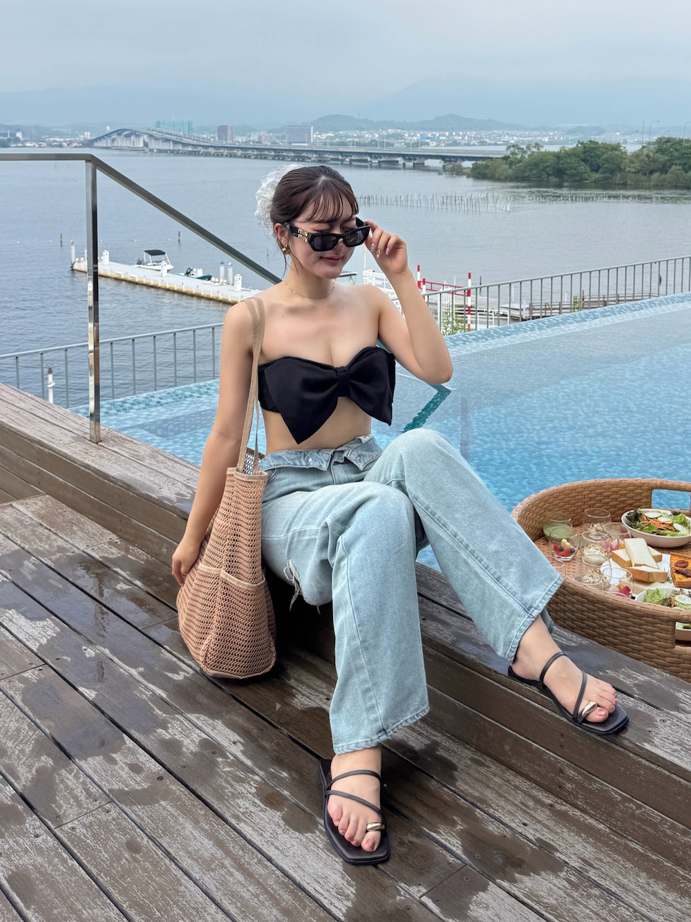 リボンの形が可愛い水着に デニムを合わせました✨ デニムは後ろが開いていてめちゃめちゃ可愛いの🥹💕