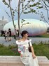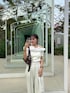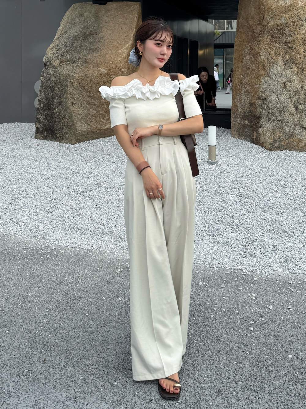 ホワイトとブラウンで色味を合わせた 綺麗めコーデ🤎 水色のシュシュで夏らしさをプラスしました!✨