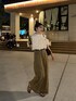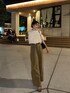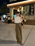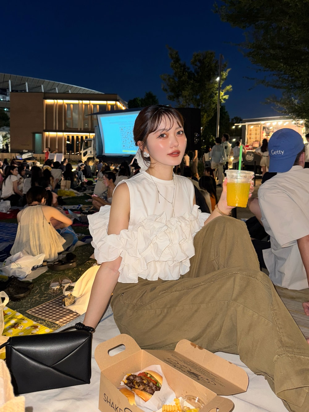 明治公園でナイトシアターを見に行ってきました✨ 夜なので 白のトップスを合わせました♪ フリルの存在感が可愛いアイテムです💕 ボトムスは秋を少し先取りしたカーキのデニムにしました🫶🏻