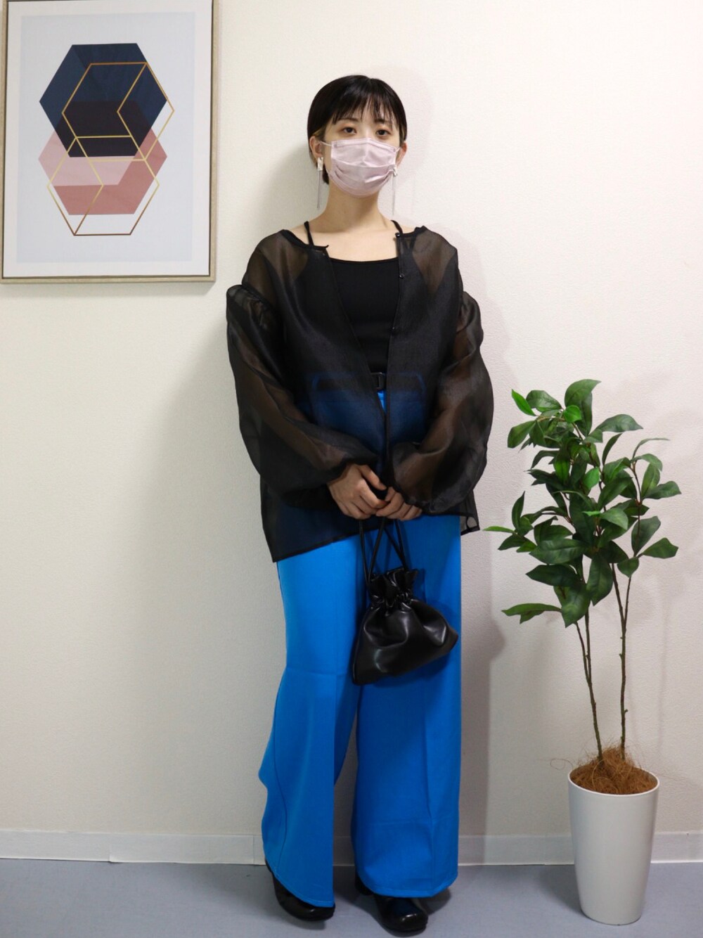 グレイルのブルーのパンツ!インパクトは抜群!上もシアーのあるアイテム使用して色味も少し抑えめに 見ていただきありがとうございます😊 フォローしていただけたら嬉しいです✨