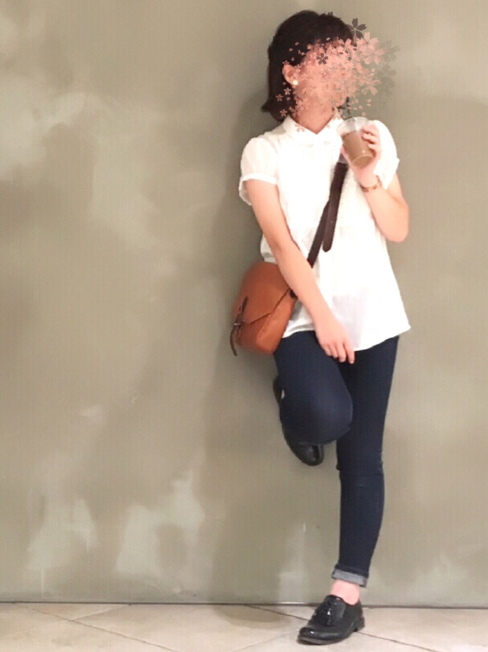 友達にWEARっぽい写真を撮ってもらった。笑 シンプル〜動きやすい〜!平凡な格好😂 このブラウス5年くらい着てる。笑