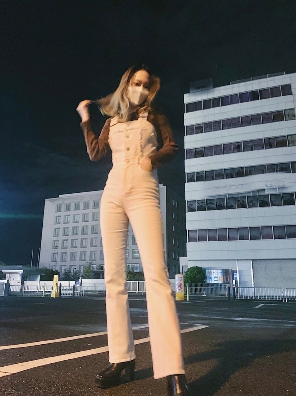 ホワイトサロペは大優勝🏆 まだちょっと寒いのでインナーと 合わせるのも超絶可愛い🤍🤎 夜に写真撮るのは失敗なので今度は お昼に再挑戦しよう、、