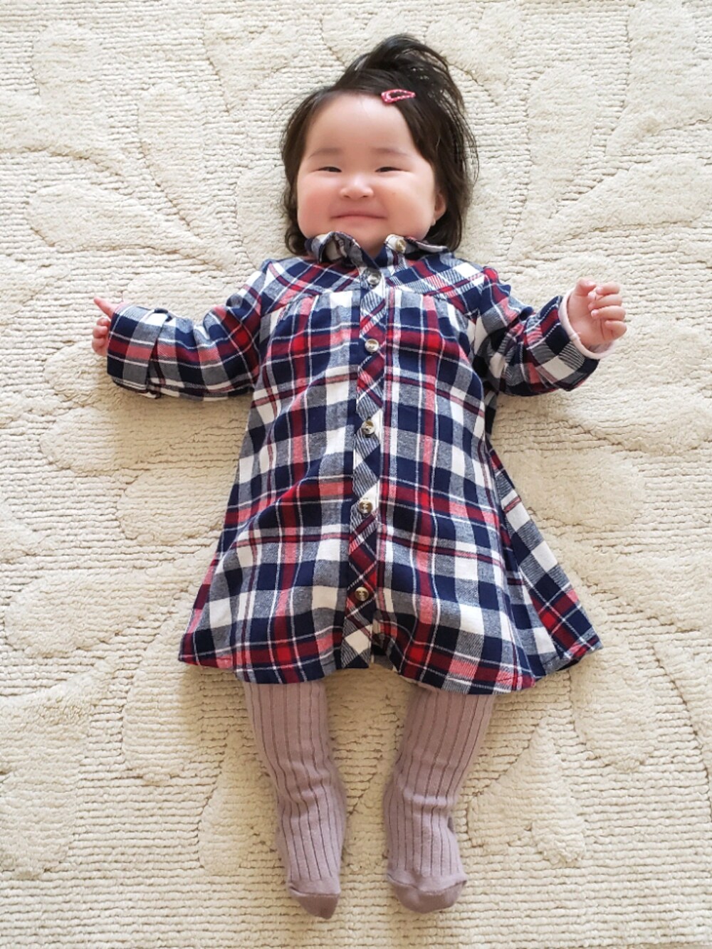 🌸0歳8ヶ月女の子ベビー 🌸西松屋さんサイズ90のチェックシャツ(チュニックかも)、袖2回まくり🙌 🌸マスクを試みるもののすぐ取ってしまう😂