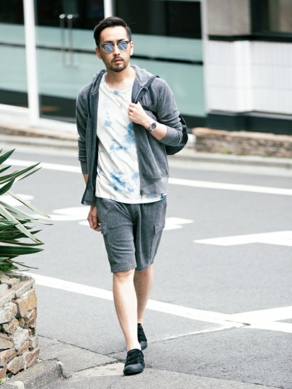 カジュアルな同素材のセットアップアイテムで、夏の大人のリラックススタイルに。派手すぎず地味になりすぎないインナーのセレクトもポイント。