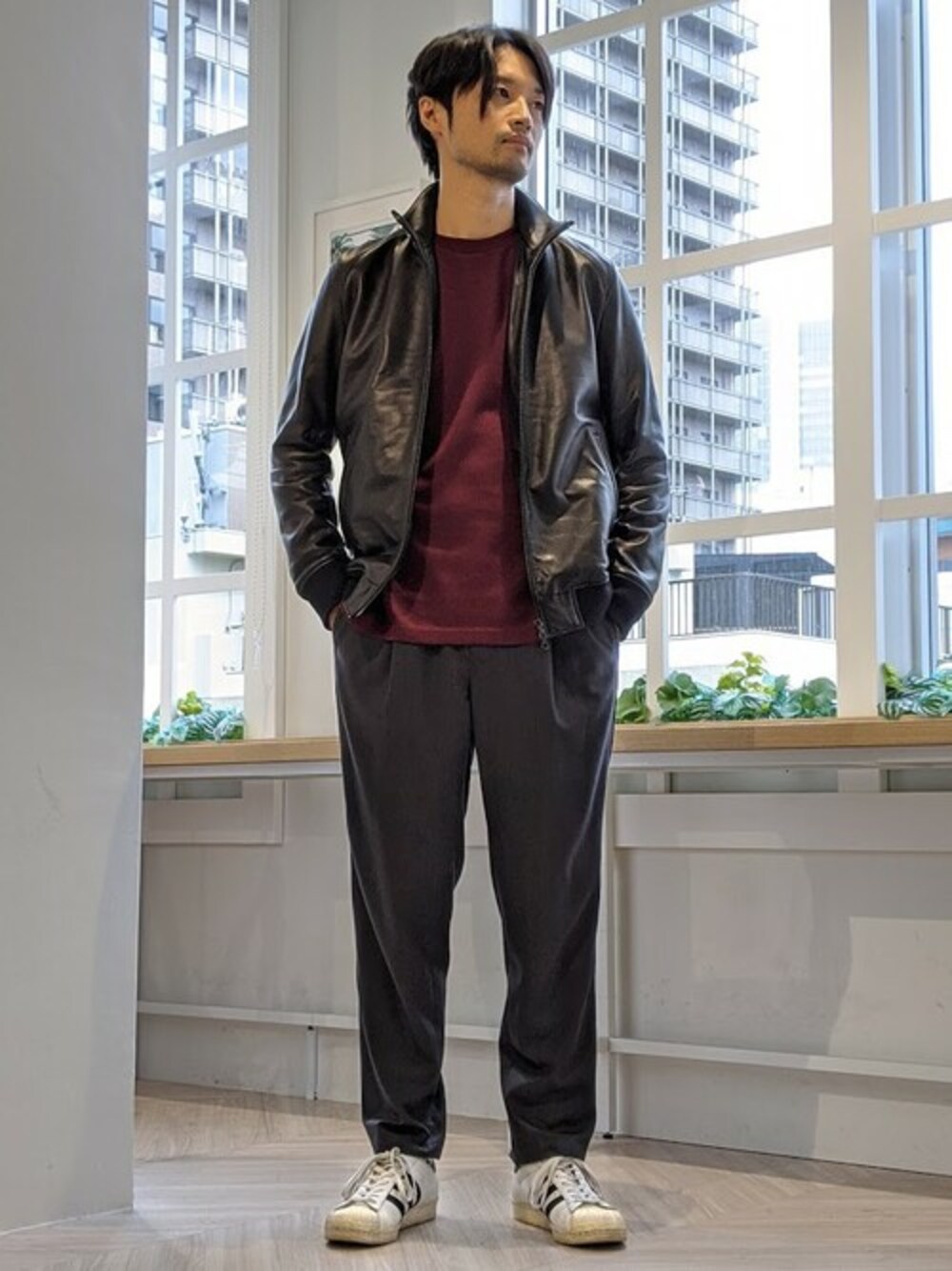 【ラムレザー ボンバージャケット】 着用サイズ:M 普段の着用サイズ:M 素材感:ラムレザーならではのソフトな素材感 着心地:リラックス 【コーデポイント】 こちらのアイテムはボンバージャケット特有のやぼったい感じはなく、すっきりと着れます。キレイ目なパンツと合わせ、大人らしい印象に仕上げました。インナーにはボルドーで秋色カラーを差したのもポイントです。