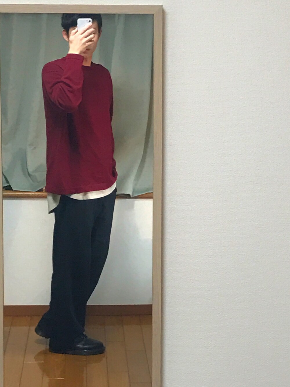 赤ニットとレイヤードとスラックス。